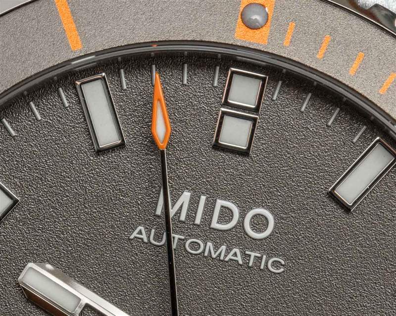 也就是說,表盤與塊狀時標和堅固、現代的指針搭配得很好。在這個特殊的鈦金屬版本上,表盤有一種啞光、有紋理的無煙煤色,帶有金屬橙色調。這是一種不常見的調色板,適用于鈦金屬表殼。表盤周圍是帶有鋁質嵌件的旋轉潛水表圈。當然,我更喜歡陶瓷插件,但以這個價格,我沒有抱怨。廣告訊息廣告信息結束