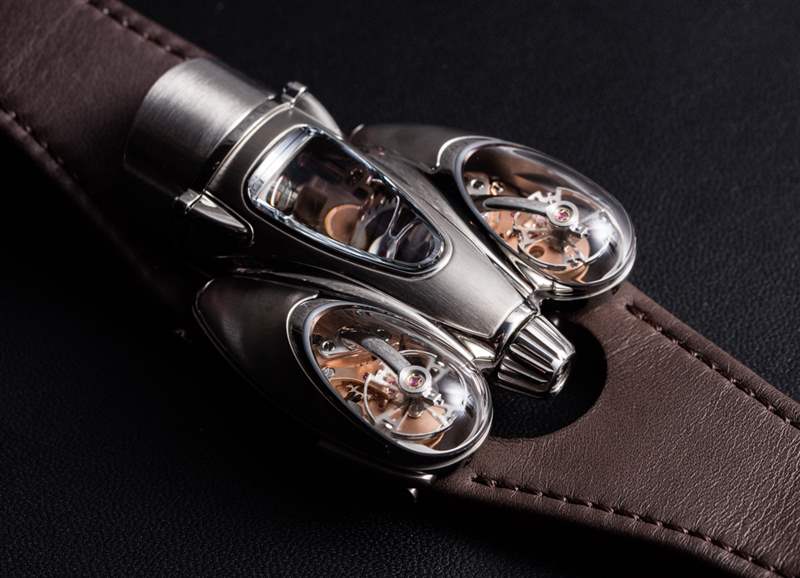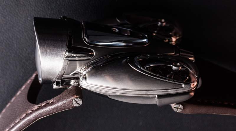 HM9 Flow 機箱的俯沖設計顯然受到了一代飛機和汽車的啟發,這些飛機和汽車的形狀在風洞中得到了完善,以增強空氣動力學性能。手表確實不需要空氣動力學特性,但如果你擁有一輛具有這種外觀的老式汽車,至少你可以擁有一款非常兼容的時計。我碰巧認為表殼曲線既漂亮又有趣,甚至優雅,盡管 MB&F 沒有讓產品看起來很女性化。