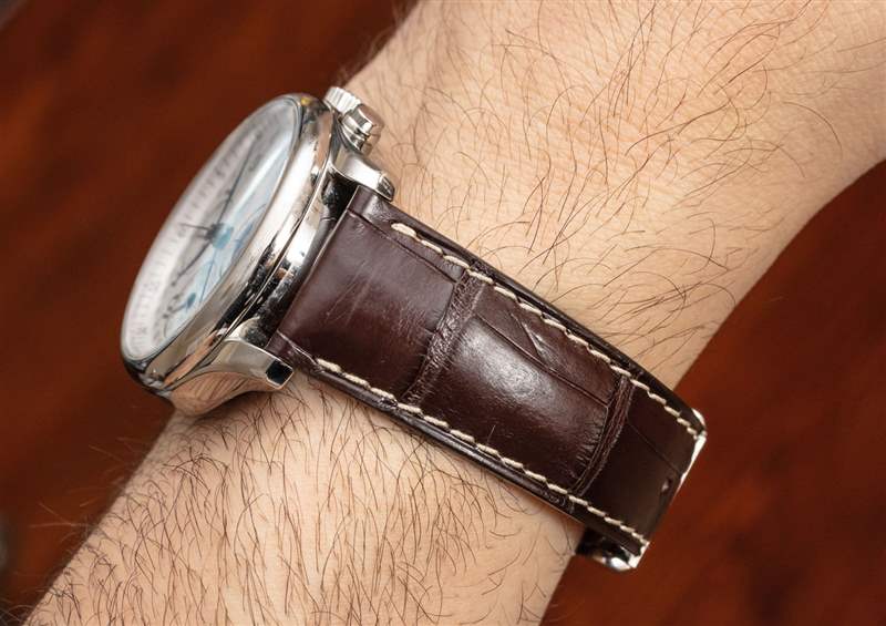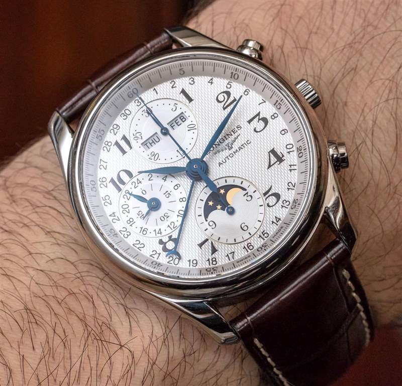 具有 30 米的防水深度,這不是一款運動手表,但它的設計具有足夠的耐用性,可以作為日常佩戴的手表使用。在棕色鱷魚皮表帶上,這款 Master Collection L26734783 具有光滑的舊世界風格魅力。浪琴表還提供了同樣的手表,它配備了參考號 L26734786 的匹配鋼金屬表鏈,使其更具現代感。我進一步感謝浪琴表不對金屬表鏈收取額外費用。無論您訂購的是表帶還是表鏈上的 Master Collection 月相計時碼表,價格都是一樣的。也就是說,浪琴表的 42 毫米寬比 40 毫米寬的版本要高出 225 美元。
