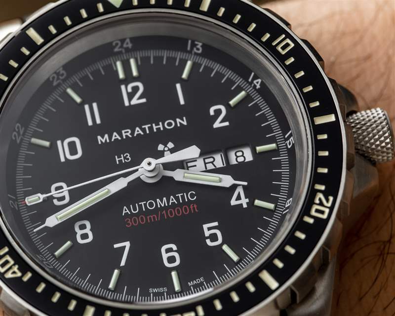 深表盤很簡單,但具有軍用手表所需的所有標記;易讀性很好。自發光氚氣管用于指針和時標,以實現完美的夜視,我喜歡將 24 小時時標放置在表盤周圍的法蘭環上,而不是占用寶貴的主表盤空間。鑒于表盤尺寸較大,星期/日期窗口并不會真正占用太多空間,即使它們確實會蠶食 3 點鐘的小時標記。我在這里要做的唯一改進是讓 Marathon 使用匹配的黑色日歷盤(而不是白色日歷盤),在表盤上具有高度對比度。
