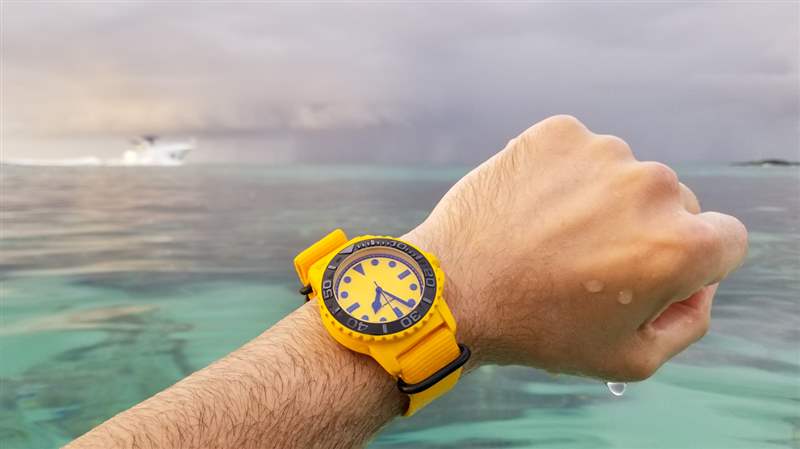 佩戴 Aqua BLK + YLW 是一種有趣的體驗,因為您開始注意到周圍的黑色和黃色的一切。黑色和黃色代表巴哈馬國旗顏色的三分之二(在拿騷周圍的藍綠色海水中,它成為國旗)。無數黑色和黃色的魚在水中游動,你會發現很多潛水設備也是黑色和黃色的。島嶼周圍也有數量驚人的服裝和比基尼組合,具有相同的配色理念。我敢打賭,在世界不同地區,這款和未來的 BLK + YLW 手表將呈現出各種身份。
