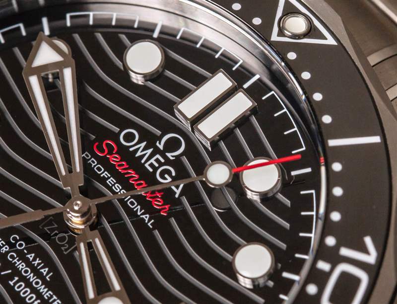 黑色陶瓷表盤具有水平波浪圖案,讓人聯想到原始 Seamaster 300M 手表表盤的外觀。幾年前更新的歐米茄海馬 300M 手表表盤上沒有波浪,提供了在市場上表現良好的新鮮外觀。為了保持一致性并幫助展示表盤上整潔的激光蝕刻,新款海馬 300M 手表為全新一代帶回了表盤波浪。