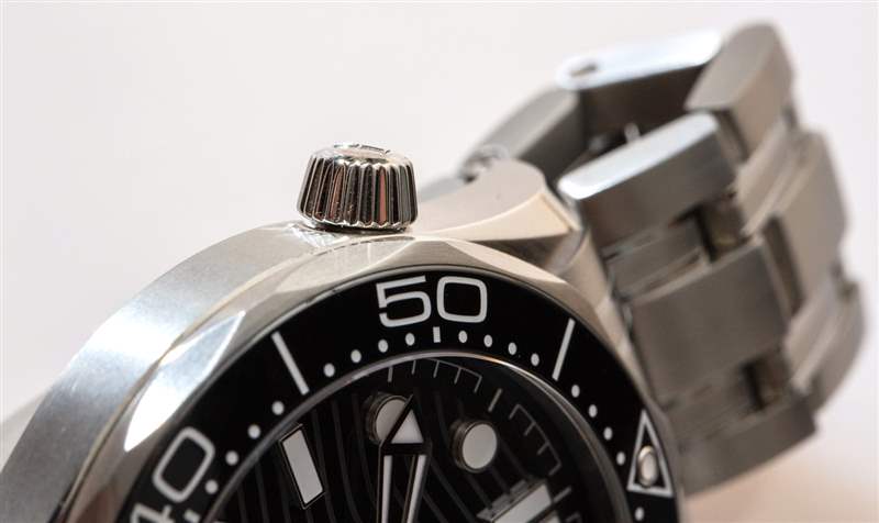 最新一代的海馬 300M 手表比上一代略大,表殼寬 42 毫米,表殼寬 41 毫米。防水深度達 300 米,表殼厚約 12 毫米,表耳到表耳的距離約為 50 毫米。佩戴舒適度很高,但它是一款笨重的手表——尤其是與金屬表鏈搭配時。對表殼進行的最有趣但微妙的更新之一是位于表殼 10 點鐘位置的氦釋放閥表冠的錐形化。這種輕微的設計調整是一種在視覺上區分新舊海馬 300M 型號的快速方法。