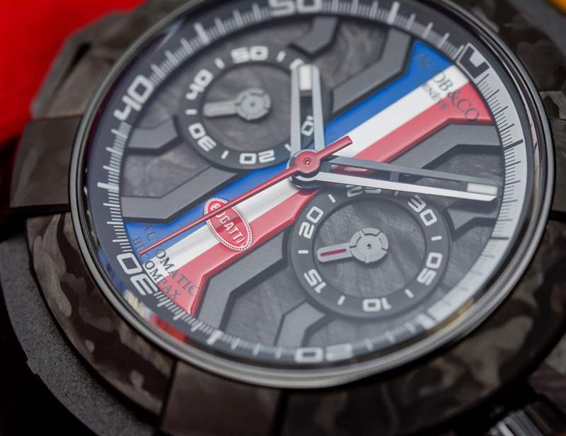 Epic X Chrono 是 Jacob & Co. 的一個有趣系列,與入門級 Jacob & Co. 手表的價格相近。對于這個特別的布加迪版本,Jacob & Co. 創造了一個外觀整潔的黑色鍛造碳(非常輕)和深色 DLC 涂層鈦金屬表殼。“X 風格”表盤的中間是紅色、白色和藍色,就這款手表而言,它們是布加迪的顏色。布加迪標志通常只有紅色和白色,但在某些情況下,紅色和白色(黑色)標志位于藍色背景。否則,您可以簡單地將這個表盤視為法國國旗的鐘表表現形式。
