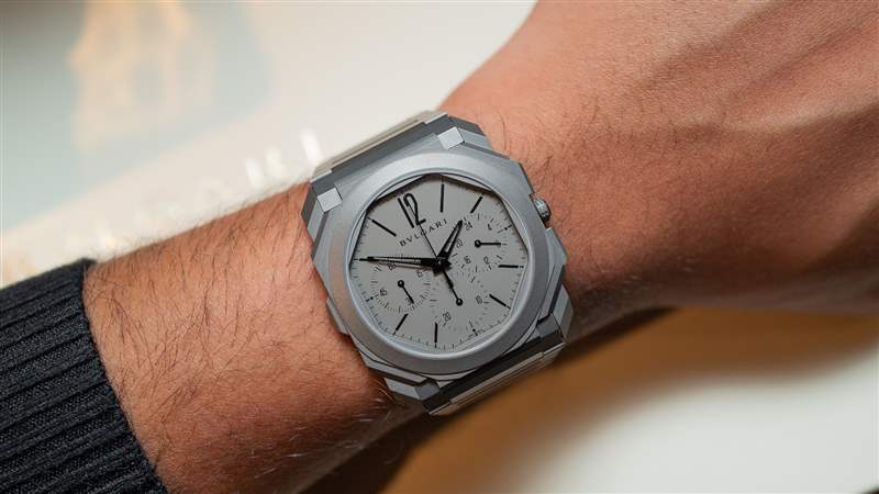 除了是世界上最薄的自動計時機芯之外,寶格麗 Octo Finissimo Chronograph GMT 的自制機芯也是最薄的自動 GMT 機芯——但寶格麗并不在吹噓。這款腕表首次采用 42 毫米寬的噴砂鈦金屬表殼,配備 30 分鐘計時碼表,以及控制主時針的按鈕,與輔助 24 小時 GMT 指針協同工作。