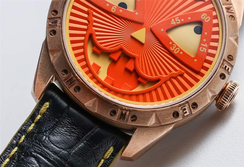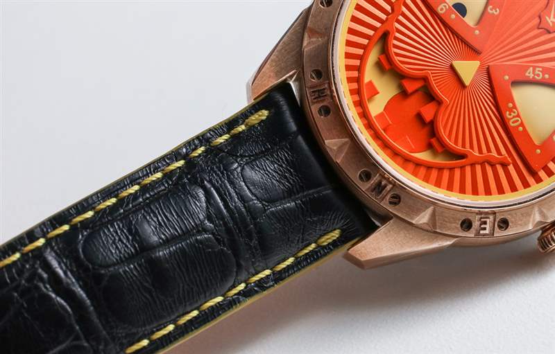 與手表搭配的是定制的黑色鱷魚皮表帶,橙色內襯和黃色滾邊以及與表殼相配的青銅色縫線。當然,這是一款有趣的手表,但并不適合所有人。實際上,它只需要吸引它的所有者。我不得不承認,雖然我可能不會每天都嫉妒,但在萬圣節那天,我想不出還有哪只手表是我寧愿戴在手腕上的。