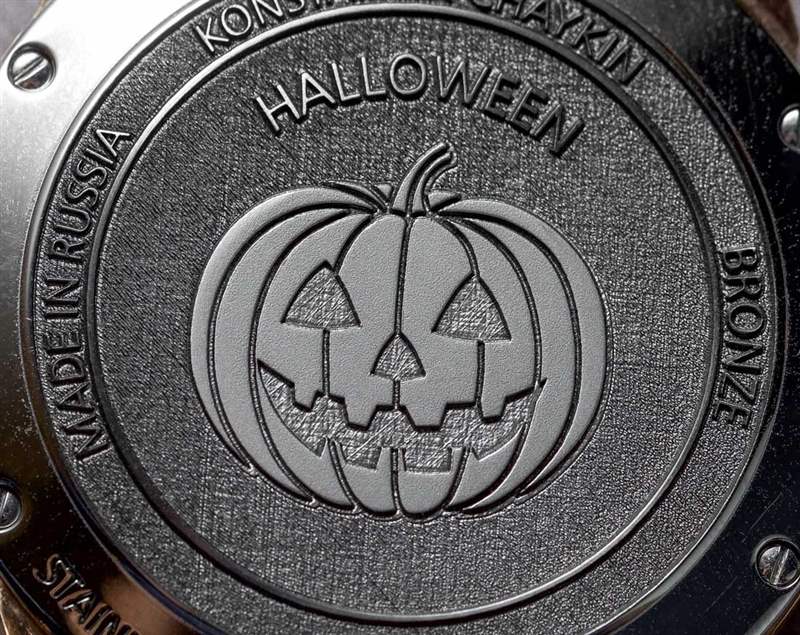 對于這個版本的小丑,Konstantin Chaykin 決定用青銅制作萬圣節——這應該會很有趣。表殼寬 42 毫米,厚 13.7 毫米。表盤上方是 AR 涂層藍寶石水晶。“萬圣節”也拼寫在整個表圈周圍。