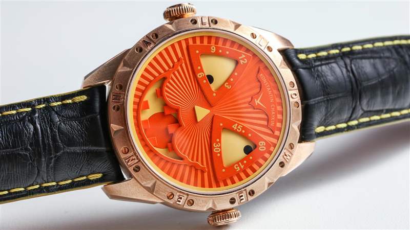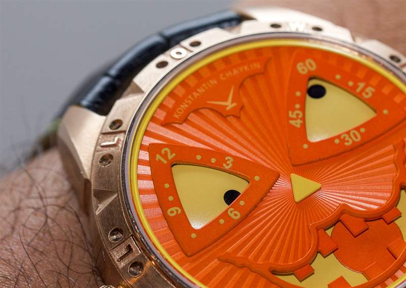 表殼背面是鋼制的,奇怪的是,Konstantin Chaykin 沒有提到手表的防水性。我將借此機會建議世界可以從 Diving Joker 手表中受益。Konstantin Chaykin 將其稱為 K07-0 機芯,為這款萬圣節南瓜提供動力。那是一個基本的瑞士 ETA 2824-2 自動機芯,帶有內部制造的時間眼睛和嘴巴月相指示器模塊。模塊本身有 61 個部分。機芯以 4Hz 頻率運行,使用該模塊,動力儲存為 38 小時。廣告訊息廣告信息結束