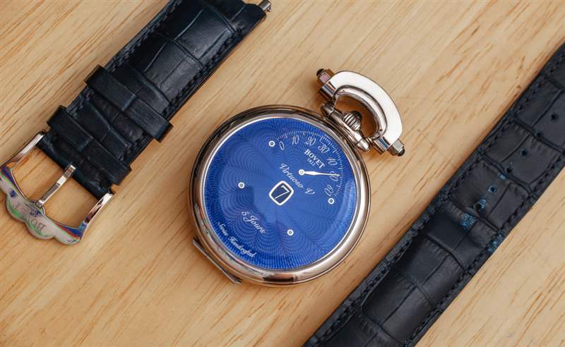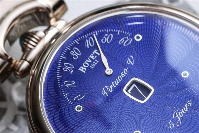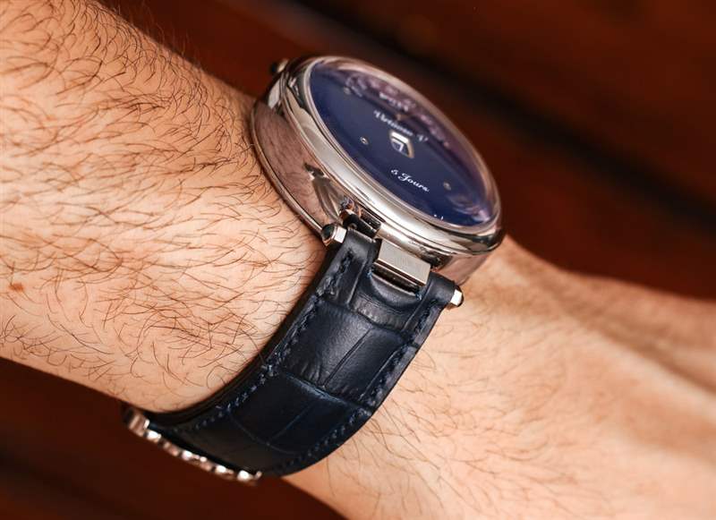 當(dāng)佩戴在手腕上時,Virtuoso V 的尺寸和重量都不是問題——盡管這不是一款特別小或特別輕的手表(里面有很多黃金!)。藍(lán)色鱷魚皮表帶與表盤上的彩色“flinqué 琺瑯風(fēng)格”雕刻和上漆工作相得益彰——其中一個表盤幾乎完全雕刻和上漆在這款稀有版本的腕表上。這個版本的 Virtuoso V 在審查時甚至沒有出現(xiàn)在播威網(wǎng)站上——其他版本(不同的表殼材料和可選的鉆石)在表盤的跳時指示器側(cè)具有不同的外觀。