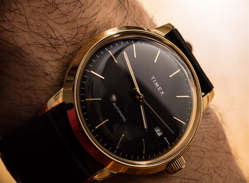 雖然表盤設計不同,采用更中性的棒狀時標和相配的指針,但 Timex Marlin Automatic 的主要賣點是其 40 毫米寬的表殼尺寸和使用日本自動機械機芯。盡管一旦您將手表拿在手中,您就會欣賞所有部件的完美結合。同樣,較小的 Timex Marlin 僅 34 毫米寬(通常被認為不足以滿足當今男性的口味),并使用中國制造的手動上鏈機芯。Marlin Automatic 上舒適的拋光鋼表殼的造型比我想象的要優雅得多。圓頂“盒子式”礦物水晶為表盤帶來令人印象深刻的視覺效果,表盤本身呈柔和的圓頂,有助于增添一種受歡迎的深度感。請注意,Marlin Automatic 表殼在設計和尺寸上都不同于 34 毫米 Marlin 表殼,在我看來也是一次重大升級。我真的很喜歡彎曲的礦物水晶玻璃與表殼本身之間的平滑結合,以及硬線和曲面之間的混合。表殼寬 40 毫米,厚約 11 毫米,防水深度 30 米。它還具有約 48 毫米的凸耳到凸耳距離,是一個非常耐磨的平臺。廣告訊息廣告信息結束