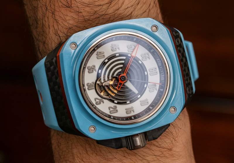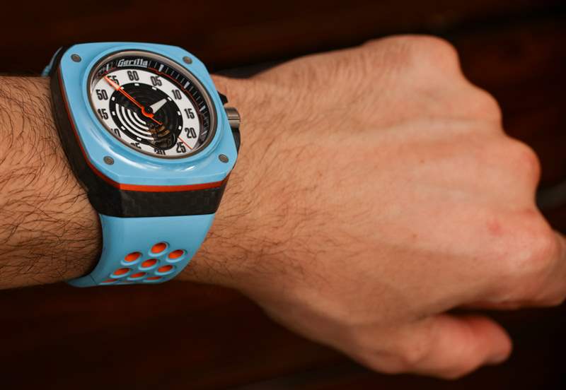 Fastback GT Mirage 表殼呈方形,寬 44 毫米(表冠寬 48.5 毫米),防水深度達 100 米。由于表殼形狀和寬肩帶,它穿得很大——但這就是 Gorilla 想要的外觀。我會爭辯說,盡管尺寸很大,但手表佩戴起來很舒服。對于 Mirage 版本的手表,Gorilla 繼續(xù)采用鍛造碳表殼,在此型號上,表耳結(jié)構(gòu)附近有一些碳纖維紋理(一個容易錯過的細節(jié))。該表殼還使用鋼、鈦、陽極氧化鋁作為表圈下方的橙色環(huán),以及用于表圈本身的陶瓷。這是我見過的少數(shù)幾款使用“粉藍色”陶瓷部件的手表之一——如今這仍然不常見。表盤上方是 AR 涂層藍寶石水晶。廣告訊息廣告信息結(jié)束