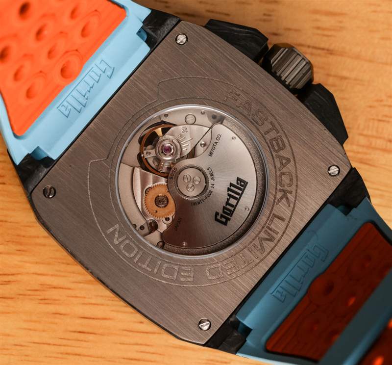 對于 Fastback GT Mirage,Gorilla 做了一些不同的事情,除了改變現(xiàn)有 Fackback 系列的顏色(沒有“GT”)。與 Fastback 相比,這款 Fastback GT Mirage 的主要區(qū)別在于升級的機芯(除了顏色)。Miyota 不再是 8XXX 系列日本 Miyota 機芯,而是來自 Miyota 9XXX 系列,在這種情況下是 Miyota 90S5 機芯。這款自動機芯以 4 赫茲的頻率運行,具有 48 小時的動力儲存,并且通過手表的表盤可以看到外露的擒縱機構(gòu)。90S5在性能和外觀上都是升級版。您可以通過表殼背面的水晶窗看到機芯的其余部分。