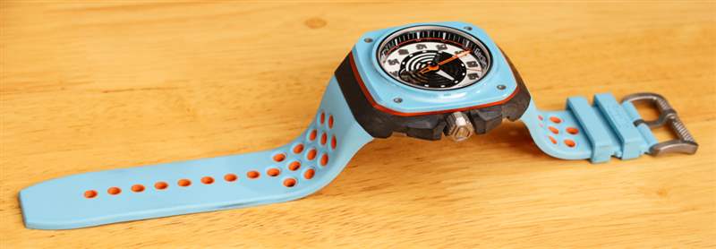 海灣石油/賽車藍和橙色主題的大部分體現(xiàn)在雙色橡膠表帶上,表帶外側(cè)為藍色,內(nèi)側(cè)為橙色。橙色可以通過表帶上的穿孔識別出來,我認為大猩猩在設(shè)計如何使用顏色方面做得很好。連接到表帶的是一個鈦扣。