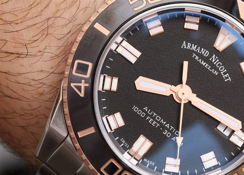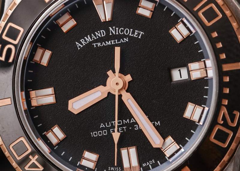 除了金屬手鏈之外,我還想要一條橡膠表帶,這實(shí)際上是一件好事。Armand Nicolet 設(shè)法制造出一款新的潛水表,它不會(huì)立即讓人感覺(jué)像其他品牌的潛水表,同時(shí)它也設(shè)法讓人感覺(jué)現(xiàn)代和陽(yáng)剛。不,該設(shè)計(jì)并不適合所有人,但每當(dāng)我看到有人嘗試新事物時(shí),我都會(huì)非常高興。Armand Nicolet 的靈感當(dāng)然來(lái)自以宇舶 Big Bang 為代表的手表設(shè)計(jì)風(fēng)格(大膽、工業(yè)、男子氣概的風(fēng)格,混合了許多顏色和材料)。同時(shí)你會(huì)感覺(jué)到這款手表可以用作工具表。我最喜歡這款黑色和玫瑰金色 JS9 版本的功能之一是時(shí)針、分針和秒針的啞光處理。
