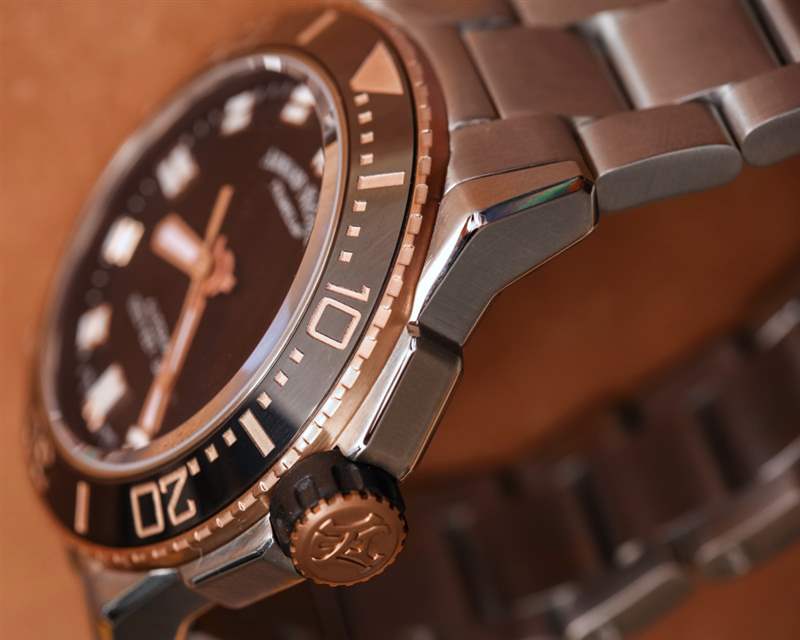 表盤(pán)周?chē)俏疑厦嫣岬降膬A斜旋轉(zhuǎn)潛水表圈。表圈嵌件材料采用拋光黑色陶瓷,表圈上的機(jī)切數(shù)字根據(jù)JS9的版本涂有不同的顏色。除了這種玫瑰金色油漆外,其他版本還使用了白色/銀色。JS9 的表盤(pán)顏色目前為白色、黑色和藍(lán)色。Armand Nicolet 似乎真的很喜歡玫瑰金外觀,因?yàn)?2018 年可用的 JS9 型號(hào)中有一半以上采用這種顏色。一些最有趣的與審查版本相似,但帶有白色表盤(pán)。“經(jīng)典” JS9 潛水表型號(hào)可能是帶有銀色/白色文字/標(biāo)記和藍(lán)色或黑色表盤(pán)的型號(hào)。