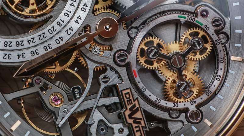 我還沒有談到我最喜歡的機芯功能,這就是德威特所說的“雙逆跳秒”指示器。我對這個詞有點異議,因為它過去曾被用來指代兩個不同的逆行計數器,而不是 DeWitt 在 DW1105S 機芯中設計的(由 263 個零件組成)。我不完全確定我將要描述的并發癥是什么,但“逆行”將是該術語的一部分。對雙逆跳秒針更好的描述是“帶有雙位置指針的雙向逆跳指針”。讓我解釋一下這意味著什么。