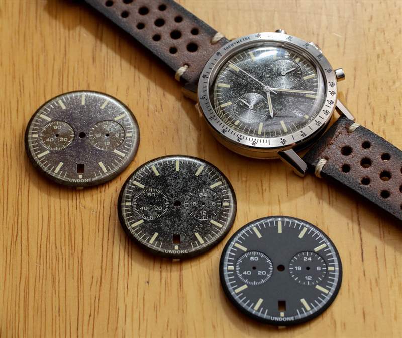 沒有標準的紋理或顏色可以讓表盤看起來變色。UNDONE 不僅需要與他們的表盤供應商合作創(chuàng)造一種新技術(shù)來產(chǎn)生這種美感,而且還需要確保它們看起來像真正的熱帶表盤。UNDONE 特別選擇了更分散的變色,而不是像在一些實際的復古熱帶表盤手表中所看到的那樣完美光滑的變色,從黑色到柔和的巧克力棕色。UNDONE實際上開發(fā)了三個熱帶表盤,每個表盤代表不同的老化“程度”。