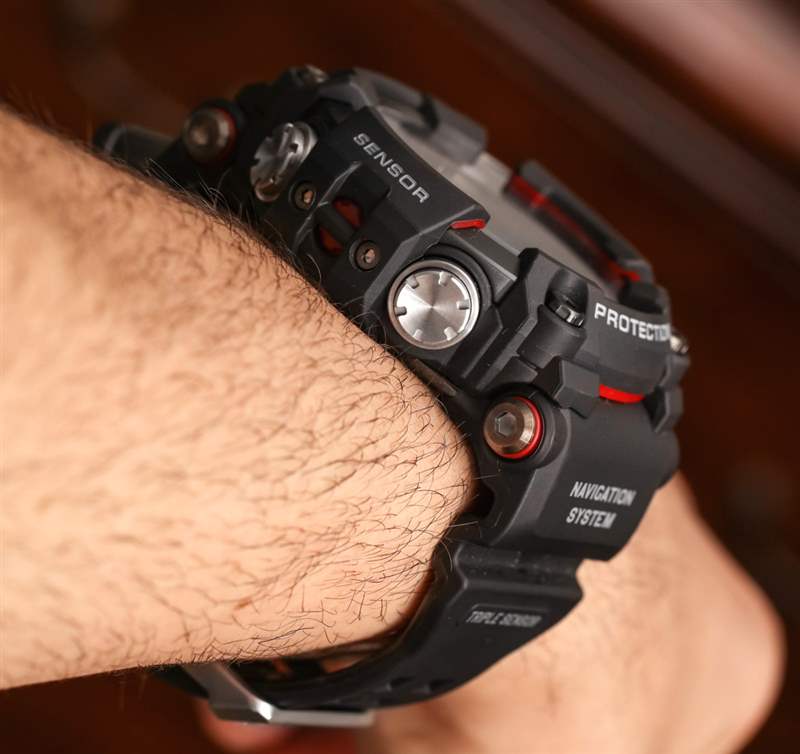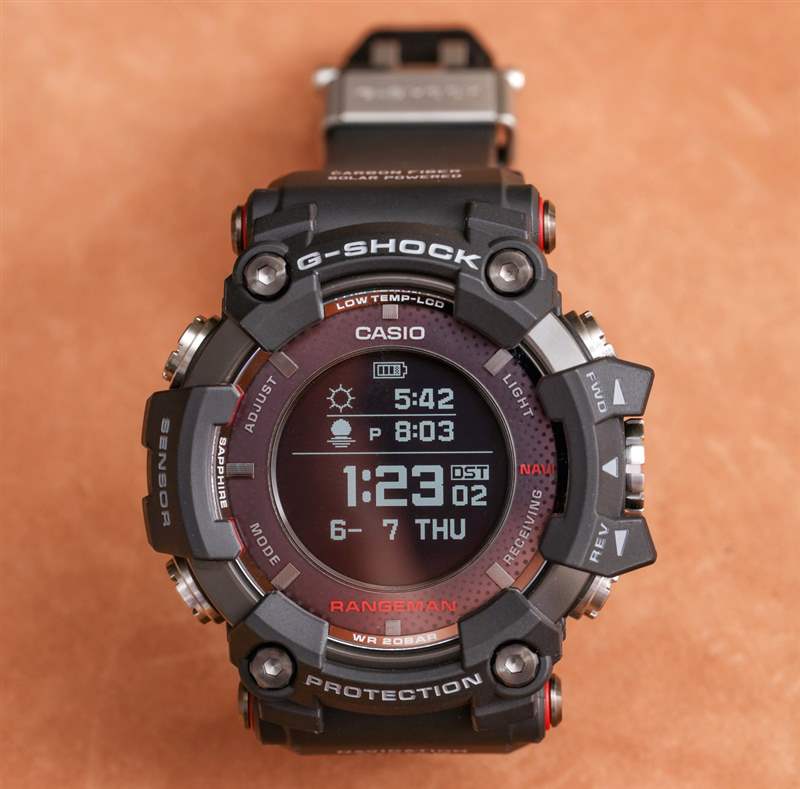 讓我們先談談缺點——因為有很多手表愛好者需要了解的“大”問題。盡管卡西歐經常和熱切地專注于嘗試使技術小型化,但 G-Shock Rangeman GPRB1000-1 是一款大型(但不重)時計。它是可穿戴的——但對于像我這樣的小手腕來說,它的尺寸有點滑稽。卡西歐盡一切可能使 GPRB1000-1 舒適且可穿戴,但對于手腕尺寸適中的人來說,手表的尺寸可能很容易看起來不成比例。表殼重 142 克,不算重,但寬 57.7 毫米,長 60.3 毫米,厚 20.2 毫米。這也意味著一條很長的表帶。總而言之,這是一款理想的冒險手表,可以戴在某種類型的夾克或西裝上,或者日常佩戴在較大的手腕上。如果你帶著手表去遠足或徒步旅行,你當然可以,但有些人可能更喜歡“不礙事”的時計,除非他們經常使用導航功能。卡西歐將在未來將這樣的手表做得更小,暫時我們可以驚嘆于仍然是可穿戴包裝中的所有這些技術。